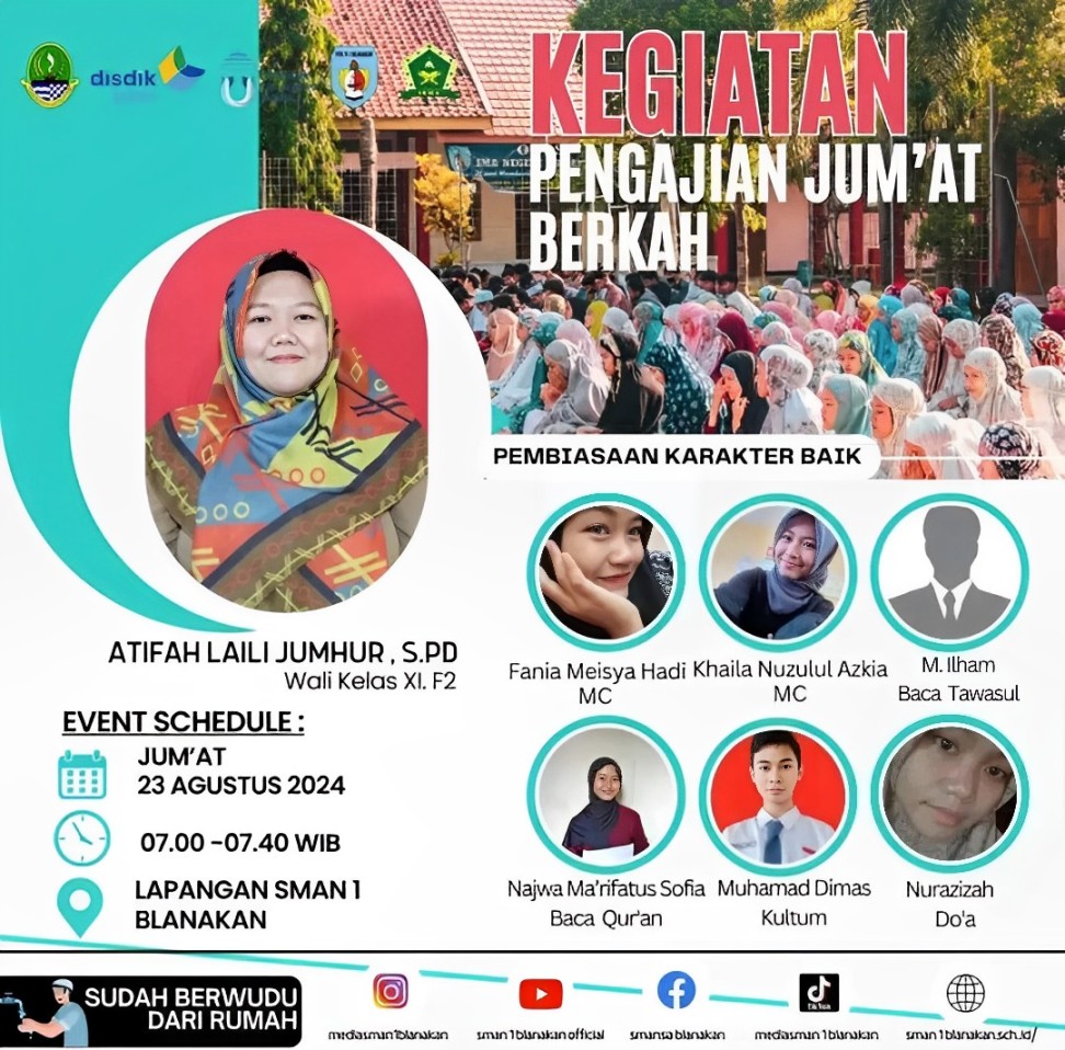 Kegiatan Pengajian rutin Jumat berkah, Jumat 23 Agustus 2024 Jam 07.00 - 07.40 WIB di Lapangan SMAN 1 BLANAKAN