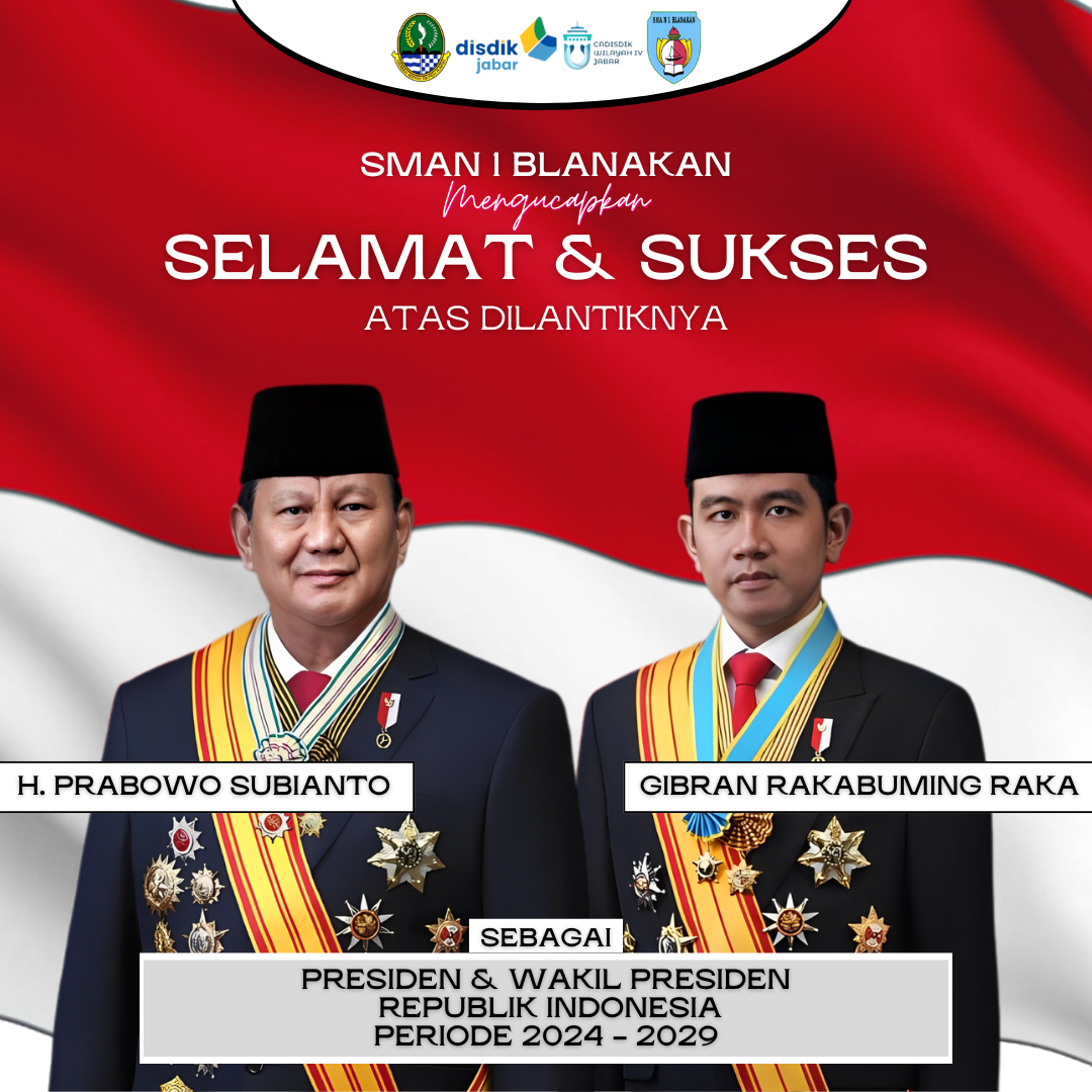 Keluarga Besar SMA Negeri 1 Blanakan mengucapkan Selamat & Sukses atas dilantiknya H. Prabowo Subianto dan Gibran Rakabuming Raka sebagai Presiden & Wakil Presiden Republik Indonesia Periode 2024 - 2029