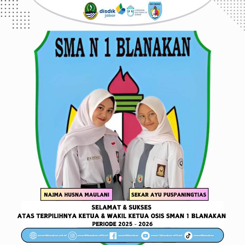 Ucapan Selamat, atas terpilihnya Ketua OSIS Baru SMA Negeri 1 Blanakan Periode 2025 - 2026. Semoga dapat menjalankan tugasnya dengan baik juga benar dan semoga Ketua OSIS yang baru dapat menjalankan perannya sesuai dengan jabatannya.